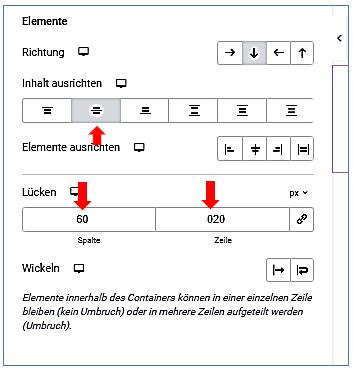 Container bearbeiten / Layout / Elemente / Lücken: Spalte: 60 px - Zeile: 60 px