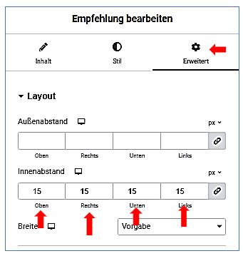 Empfehlung bearbeiten / Erweitert / Breite: individuell /