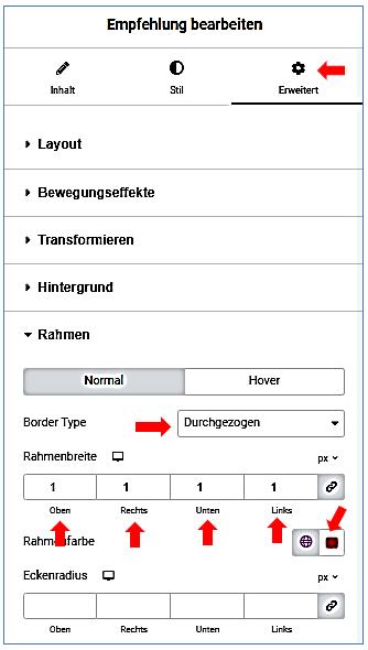 Empfehlung bearbeiten / Erweitert / Rahmen / Layout