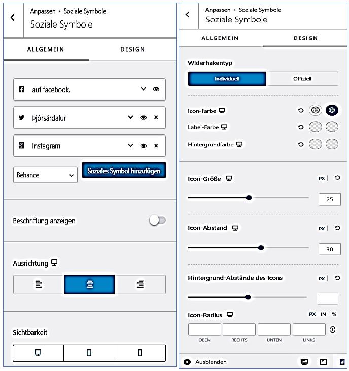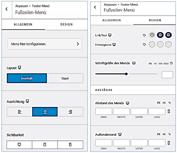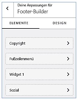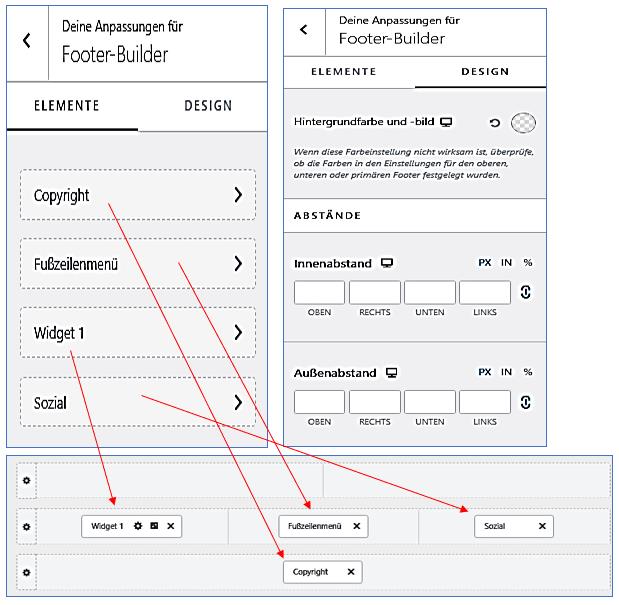Customizer / Header-Builder / Elemente + Allgemein (Screenshots)