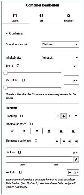 Im Reiter „Layout“ des Flexbox-Containers finden Sie mehrere wichtige Einstellungen, die Ihnen helfen, die Positionierung und das Verhalten der enthaltenen Elemente zu steuern.
