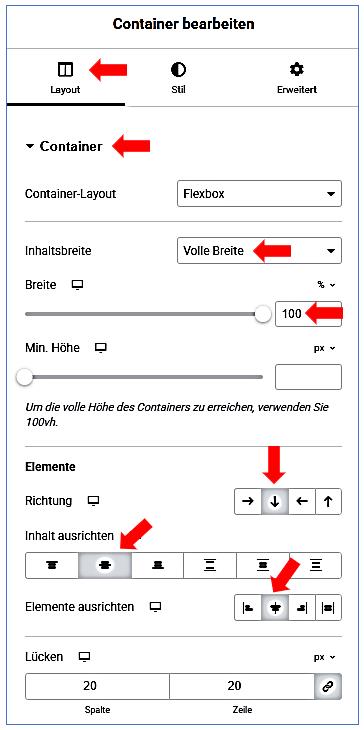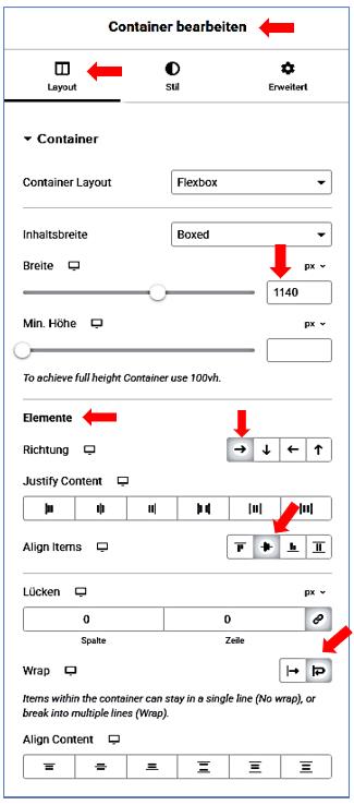 Container bearbeiten / Erweitert / Layout / Innenabstand