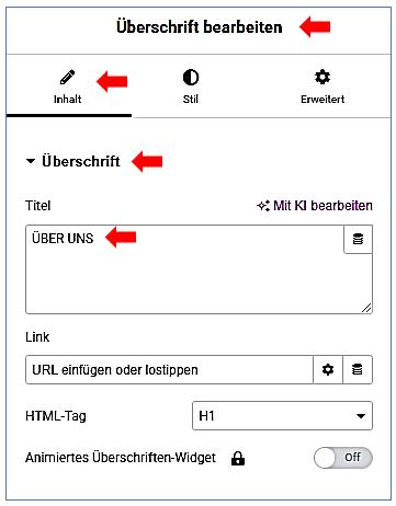 hier ändern Sie lediglich die beiden Widgets Überschrift Unsere Mission und den Text darunter