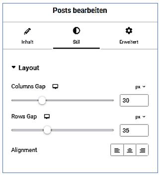 Wählen Sie zwischen verschiedenen Layouts wie „Grid“, „Masonary“ oder „Carousel“. Jedes Layout hat seine eigene Darstellung und kann je nach Bedarf angepasst werden. - Beitragsanzahl: