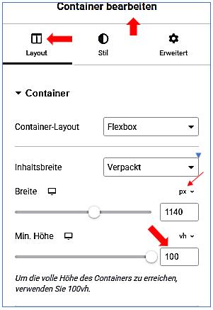 Container bearbeiten / Layout / Container / Mind. Höhe /