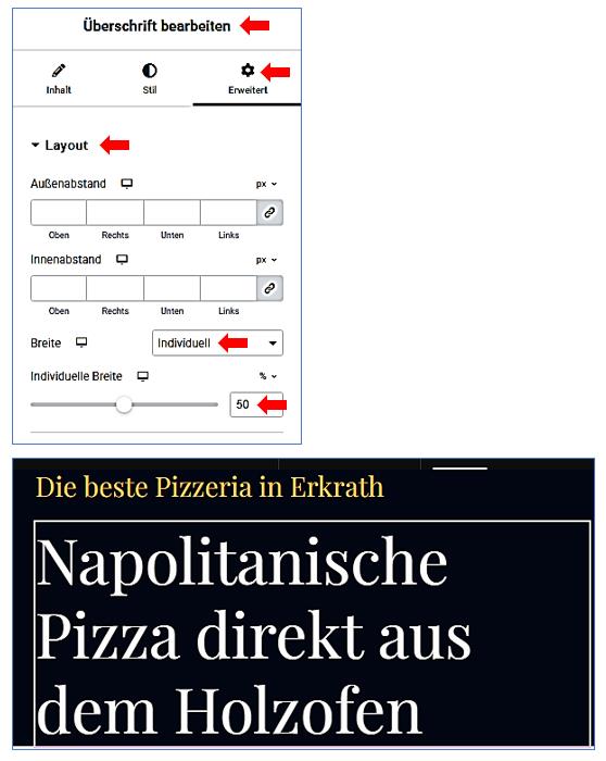 Überschrift bearbeiten / Erweitert / Layout / Breite: individuell 50%