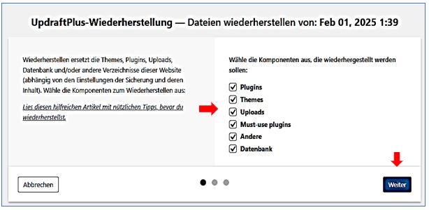 Wählen Sie aus, welche Teile des Backups Sie wiederherstellen möchten (z. B. Datenbank, Plugins, Themen)
